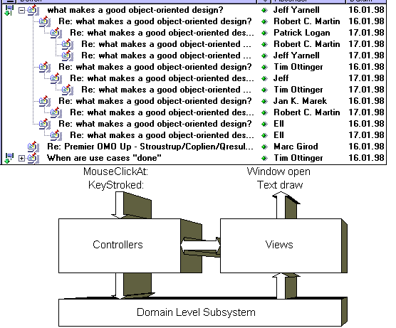 Visualization and manipulation are complex tasks,... Consider a tree view on the different threads of a news reader below. It consists of several different graphical elements, such as lines, icons, and so on. All these graphical elements show domain level information, such as status. Controlling this presentation calls for some pretty complex software. In addition to its appearance this window also offers the opportunity to read a posting, mark it, answer it in several ways, or archive it. The user accesses most of these actions with pop-up or pull-down menus and with drag-and-drop techniques. To control these actions and forward them to the domain layer are also quite sophisticated tasks. So it might be tempting to split visualization and manipulation. However, is this really a good idea? Both parts are closely coupled on two sides: At first they work on the same domain level objects, such as a news posting. On the other end the same interface entity may represent both visualization and manipulation. Consider the small diamonds in front of every author. On the visualization part it shows that I have not read this posting by now (although I should have). If you click this diamond, the reader marks the corresponding posting as read, which is clearly a manipulation task.