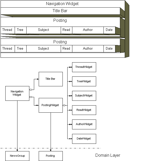 Therefore, have a single Widget class for every item on the user interface. The Widget class is linked to a complete domain level object or a single attribute of it. It handles both presentation and manipulation of the domain level object. The Widget objects form a hierarchy that corresponds to the item hierarchy on the user interface with the root object modeling the main window. Every node in this Widget hierarchy controls the lifecycle of its children. The figure below demonstrates this design for the news reader.
